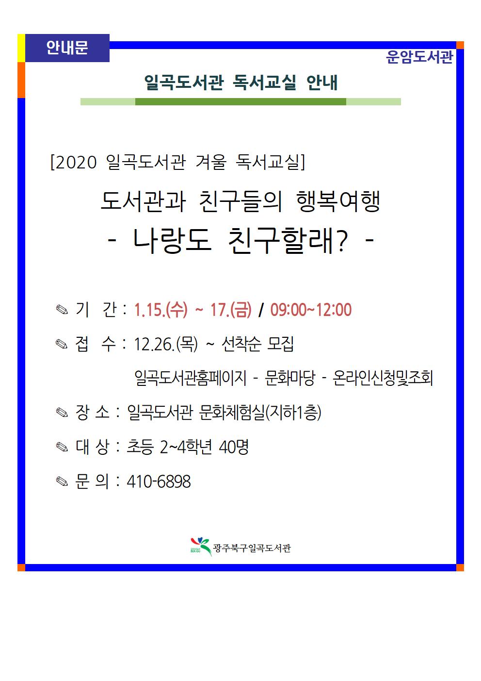 | 이전글 | 일곡 | 북구 통합도서관 리브로피아 서비스 이용 안내 | 2020-06-02 | 5418 | |