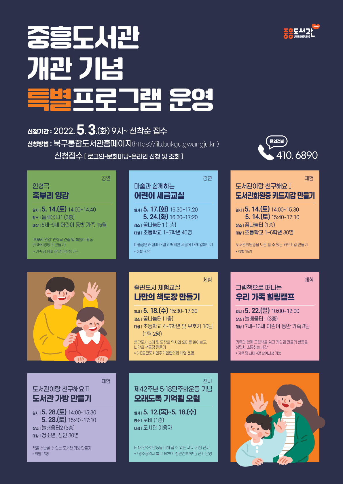 도서관새소식 중흥도서관 개관 기념 「특별프로그램 」 운영 작성자 : 운영자 조회수 : 3598 카테고리 : 중흥 프로그램 참여신청 바로가기(여기를 클릭해주세요!) 신청기간 : 5.3.(화) 오전 9시부터 ~ 선착순 마감 이전글 / 다음글 구분 카테고리 제목 제작 등록일 조회 이전글 양산 2022년 '6人 6色 릴레이 작가 초청 강연' 안내 2022-05-03 3170 다음 공통 중흥도서관 개관안내 2022-03-29 3956