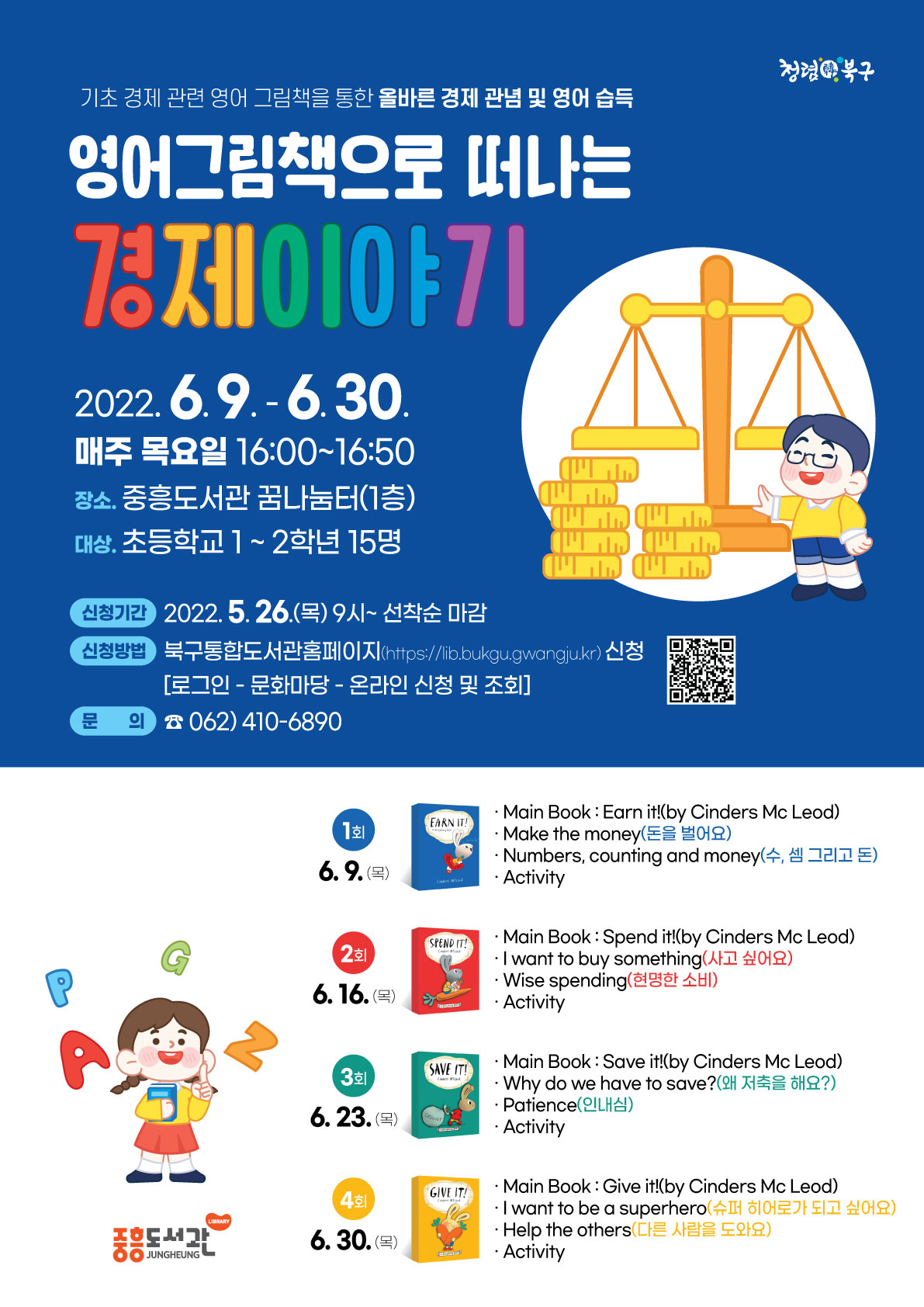 도서관새소식 [경제 특화 강좌] 『영어그림책으로 떠나는 경제이야기』 운영 작성자 : 운영자 조회수 : 2693 카테고리 : 중흥 프로그램 참여신청 바로가기(여기를 클릭해주세요!) 신청기간 : 5.26.(목) 오전 9시부터 ~ 선착순 마감 이전글 / 다음글 구분 카테고리 제목 제작 등록일 조회 이전글 운암 [시니어 아카데미]이철환 작가 초청강연회 운영 2022-05-25 2987 다음 일곡 [인문강좌] 도서관 지혜학교-남도 민속에 녹아 있는 선조들의 삶의 지혜 참여자 모집! 2022-05-22 2913