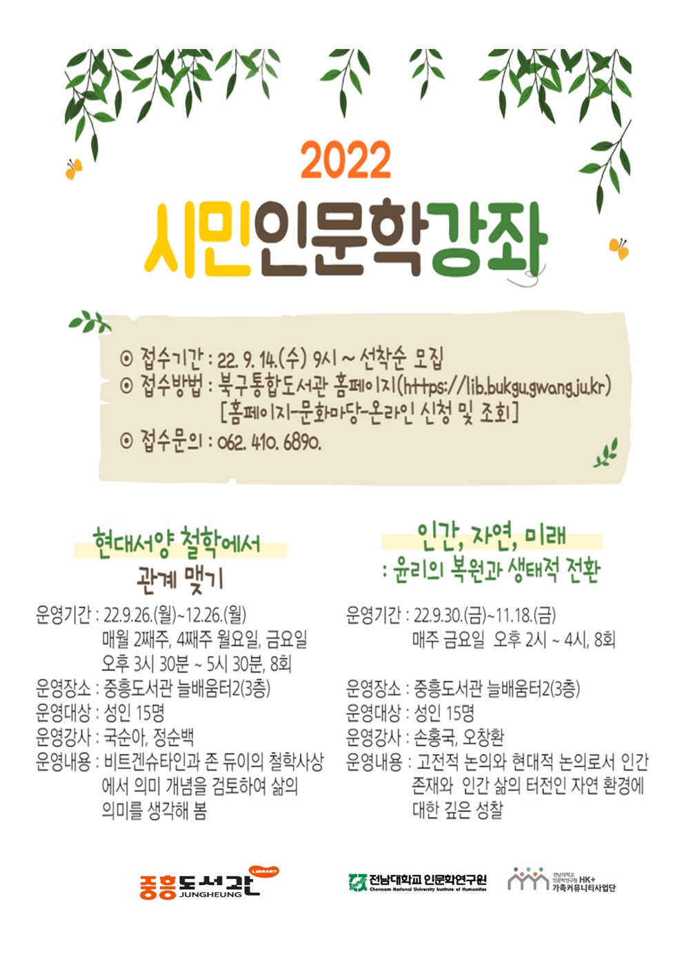 도서관새소식 2022 시민인문학강좌 작성자 : 운영자 조회수 : 2837 카테고리 : 중흥 프로그램 참여신청 바로가기(여기를 클릭해주세요!) 신청기간 : 9.14.(수) 오전 9시부터 ~ 선착순 마감 이전글 / 다음글 구분 카테고리 제목 제작 등록일 조회 이전글 신용 신용도서관 동아리 모집 공고 2022-09-20 2732 다음 신용 2022년 신용도서관 독서의 달 - 신운선 작가와의 만남 행사 안내 2022-09-07 3123