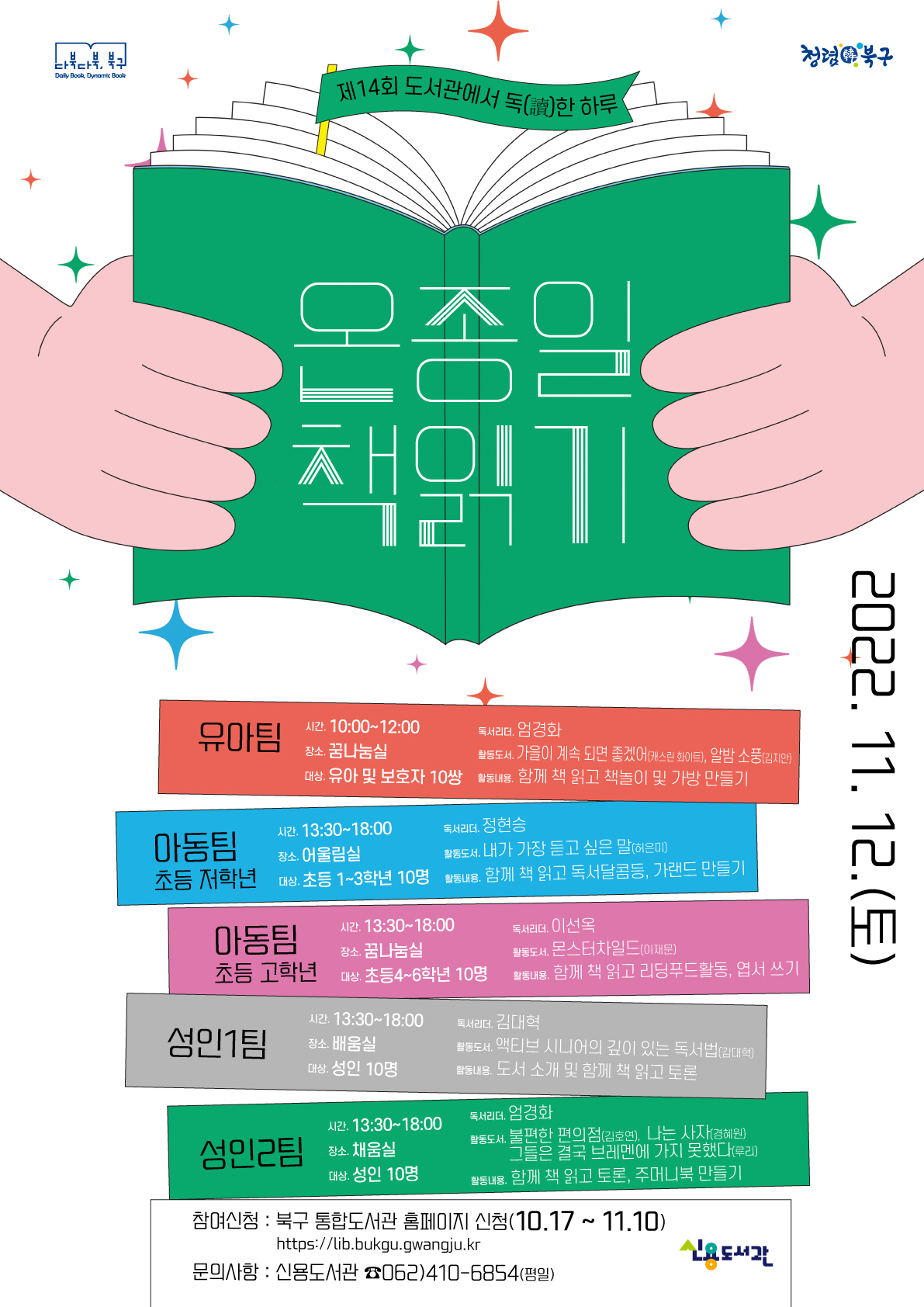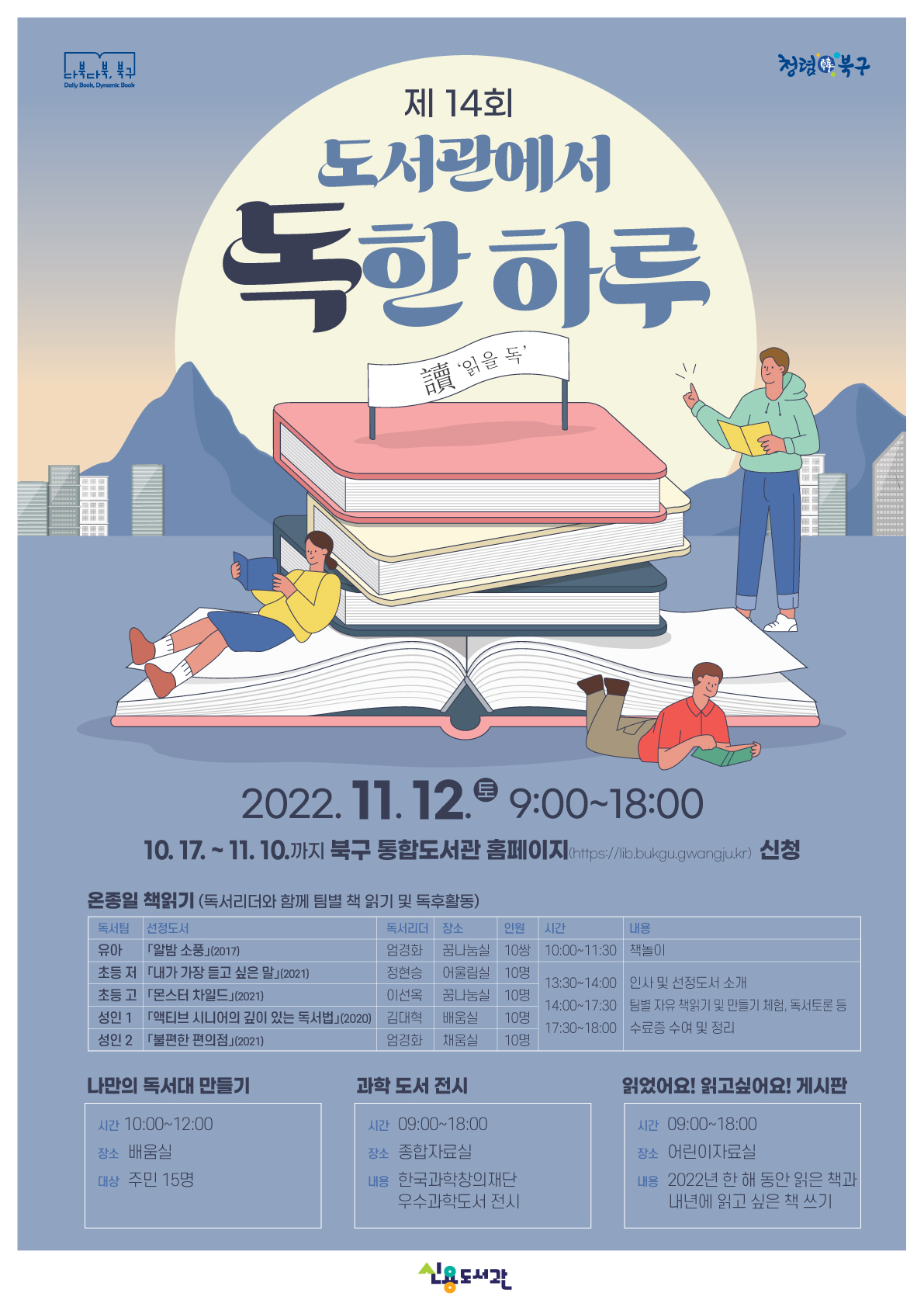 도서관새소식 제14회 도서관에서 독(讀)한 하루 행사 안내 작성자 : 운영자 조회수 : 2881 카테고리 : 신용 ▼ 독한하루 전체 행사 안내▼ 독한하루 - 온종일 책읽기 행사 세부내용 이전글 / 다음글 구분 카테고리 제목 제작 등록일 조회 이전글 중흥 (내일은 슈퍼리치)임지형 작가와의 만남 2022-10-18 2097 다음 신용 신용도서관 학습실 자원봉사자 모집 안내 2022-10-14 2784