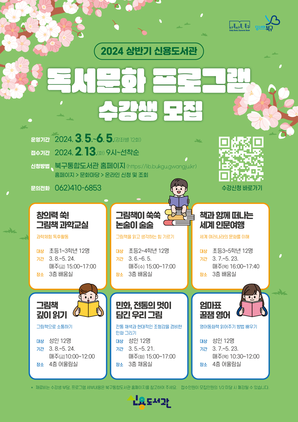 2024년 신용도서관 상반기 독서문화프로그램을 아래와 같이 운영하오니 많은 관심과 참여 부탁드립니다.