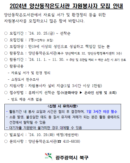양산동작은도서관 자원봉사자 모집 안내