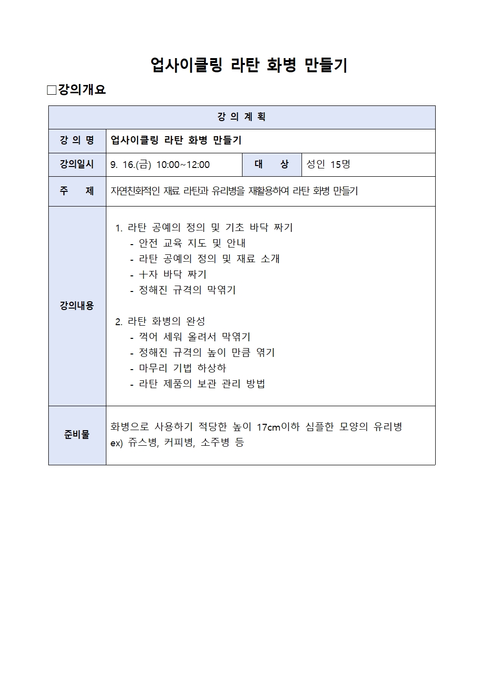 온라인 신청 및 조회 일곡도서관 [독서의 달] 업사이클링 라탄 화병 만들기 강좌대상 : 성인 15명 수강기간 : 2022-09-16 ~ 2022-09-16 10:00 ~ 12:00 (금) 접수시간 : 2022-09-01 09시 ~ 2022-09-14 00시 수강인원(인터넷/대기) : 15명 (5)명 장소 : 문화창작실 비용 : 무료 신청승인 취소하면 승인 내역에서 삭제됩니다 권**(010-2***-9***) 2022-09-01 09:00 정**(010-5***-4***) 2022-09-01 09:00 이**(010-6***-2***) 2022-09-01 09:01 이**(010-8***-9***) 2022-09-01 09:01 범**(010-2***-1***) 2022-09-01 09:01 최**(010-2***-9***) 2022-09-01 09:02 최**(010-4***-2***) 2022-09-01 09:06 하**(010-2***-2***) 2022-09-01 09:17 박**(010-5***-9***) 2022-09-01 14:39 주**(010-2***-1***) 2022-09-02 08:42 김**(010-6***-0***) 2022-09-02 09:07 김**(010-9***-1***) 2022-09-02 09:09 권**(010-4***-0***) 2022-09-02 14:54 양**(010-6***-9***) 2022-09-03 01:57 김**(010-3***-5***) 2022-09-03 02:10 대기 심**(010-8***-3***) 2022-09-03 08:30