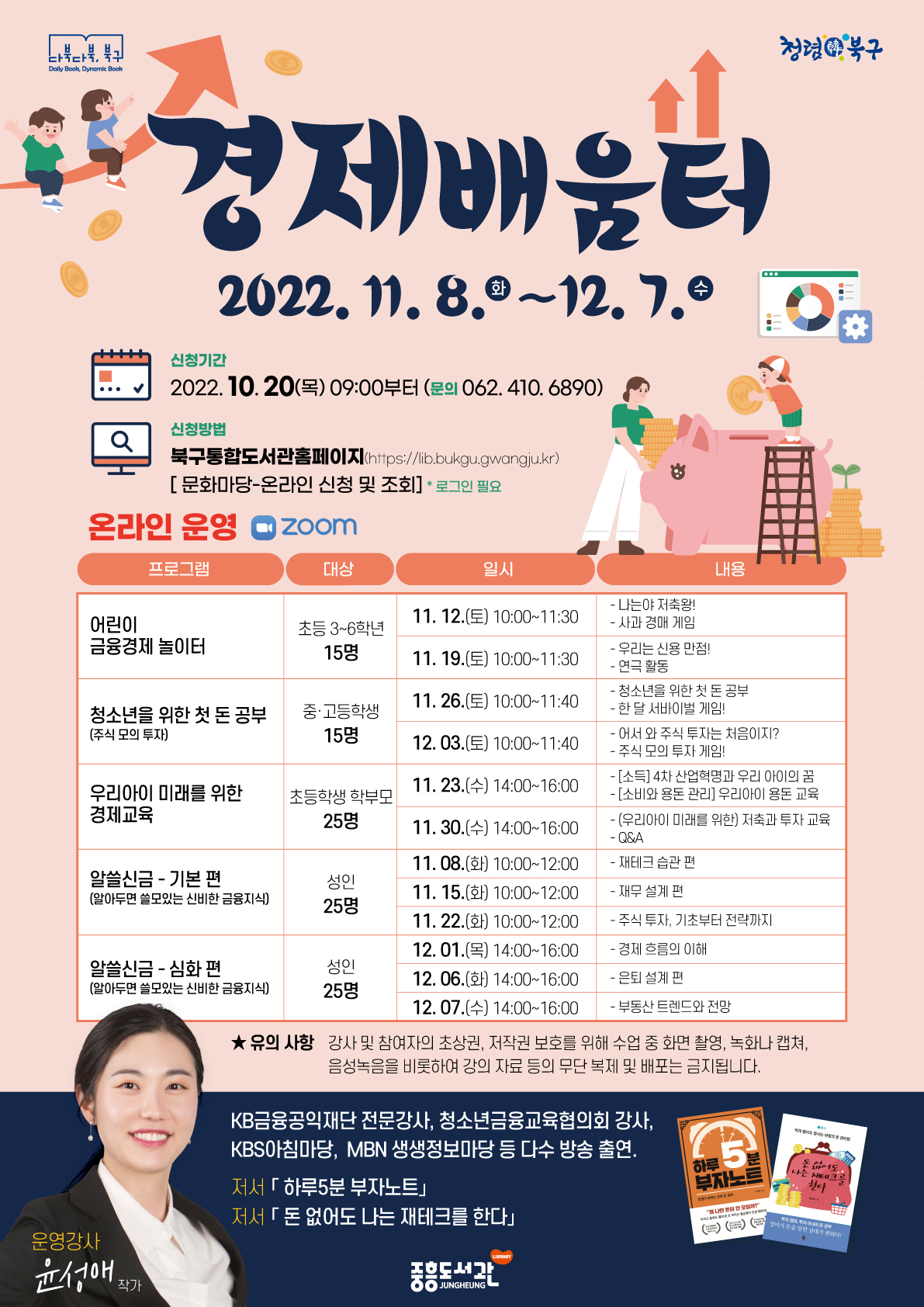 2회 | 11.30.(수) 14:00~16:00 | [저축과 투자] 우리 아이 미래를 위한 저축과 투자 교육 | - 선택과 기회비용 - 저축 - 투자 | |