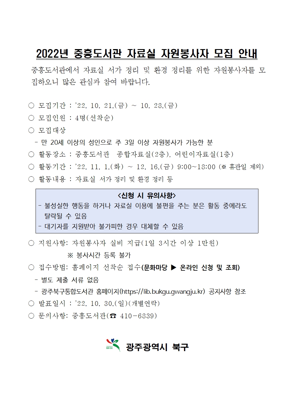 온라인 신청 및 조회 중흥도서관 중흥도서관 자료실 자원봉사자 모집 강좌대상 : 만 20세 이상의 성인, 주 3일 이상 자원봉사가 가능한 분 수강기간 : 2022-11-01 ~ 2022-12-16 09:00 ~ 18:00 (일,월,화,수,목,금,토) 접수시간 : 2022-10-21 09시 ~ 2022-10-28 00시 수강인원(인터넷/대기) : 4명 (2)명 장소 : - 비용 : 신청승인 취소하면 승인 내역에서 삭제됩니다 최**(010-3***-5***) 2022-10-24 16:58 이**(010-4***-1***) 2022-10-25 16:56 박**(010-3***-9***) 2022-10-26 18:55 황**(010-3***-8***) 2022-10-27 13:41 대기 김**(010-2***-8***) 2022-10-27 18:36