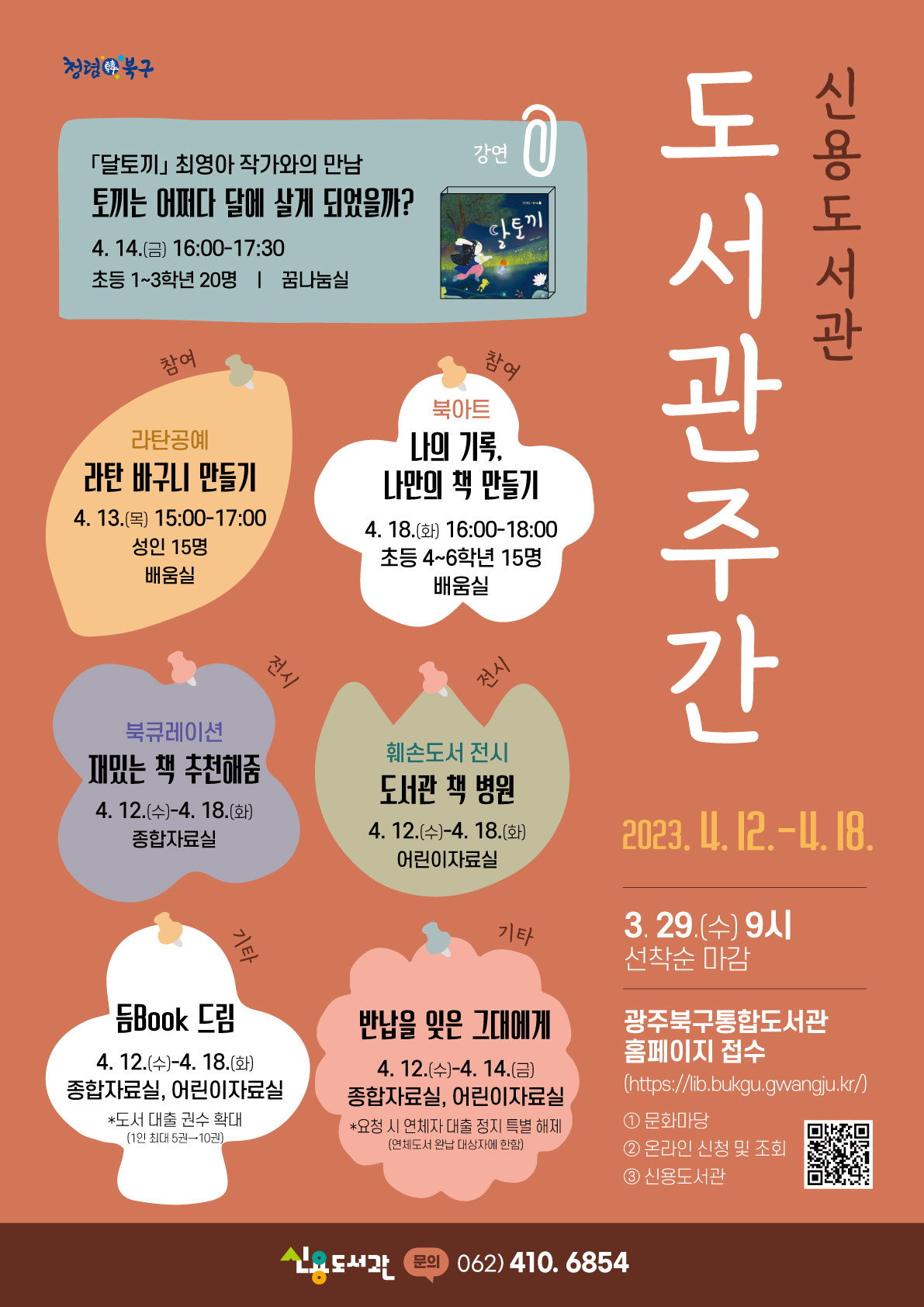 온라인 신청 및 조회 신용도서관 [도서관주간] 나의 기록, 나만의 책 만들기(북아트) 강좌대상 : 초등 3~6학년 수강기간 : 2023-04-18 ~ 2023-04-18 16:00 ~ 18:00 (화) 접수시간 : 2023-03-29 09시 ~ 2023-04-16 23시 수강인원(인터넷/대기) : 15명 (5)명 강사명 : 이선옥 장소 : 배움실 비용 : ※ 대상변경 : 초등 3~6학년○ 내용 : 함께 그림책을 읽고 내 생각과 마음 변화를 기록하는 나만의 책 만들기 북아트 활동○ 도서 : <이 작은 책을 펼쳐봐>, <민들레는 민들레> 신청승인 취소하면 승인 내역에서 삭제됩니다 기**(010-9***-0***) 2023-03-29 09:00 지**(010-9***-2***) 2023-03-29 09:03 장**(010-9***-4***) 2023-03-29 10:27 임**(010-2***-5***) 2023-03-30 12:18 이**(010-5***-1***) 2023-04-16 11:05 대기