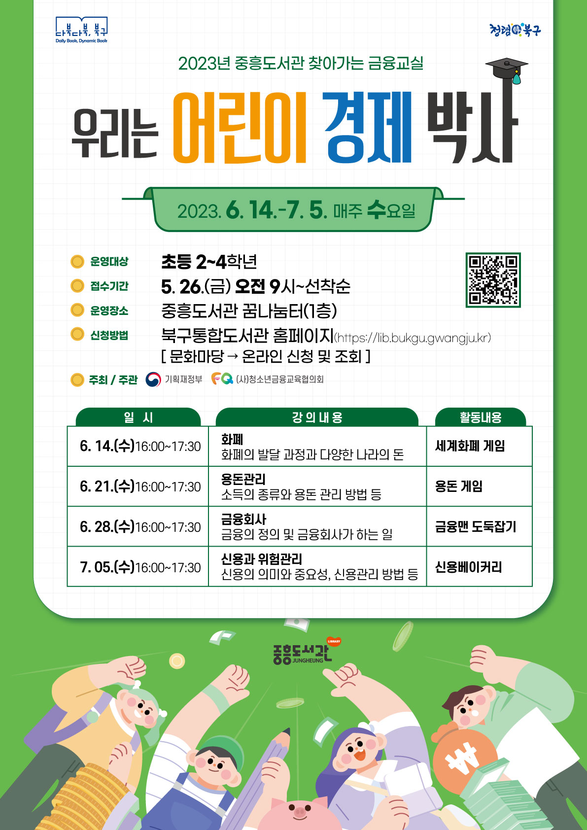 온라인 신청 및 조회 중흥도서관 [경제특화]우리는 어린이 경제 박사 강좌대상 : 초등 2~4학년 수강기간 : 2023-06-14 ~ 2023-07-05 16:00 ~ 17:30 (수) 접수시간 : 2023-05-26 09시 ~ 2023-06-09 18시 수강인원(인터넷/대기) : 15명 (3)명 강사명 : 김여진(금융교육 전문강사) 장소 : 꿈나눔터(1층) 비용 : 무료 신청승인 취소하면 승인 내역에서 삭제됩니다 정**(010-4***-2***) 2023-05-26 09:00 조**(010-4***-1***) 2023-05-26 09:00 박**(010-3***-8***) 2023-05-26 09:00 김**(010-9***-8***) 2023-05-26 09:00 위**(010-6***-8***) 2023-05-26 09:01 오**(010-4***-7***) 2023-05-26 09:01 박**(010-3***-6***) 2023-05-26 09:01 박**(010-7***-8***) 2023-05-26 10:43 임**(010-8***-5***) 2023-05-26 10:51 최**(010-9***-5***) 2023-05-26 15:46 정**(010-6***-7***) 2023-05-26 16:48 문**(010-8***-2***) 2023-05-30 14:56 방**(010-6***-2***) 2023-06-01 00:15 염**(010-4***-0***) 2023-06-01 16:34 박**(010-3***-6***) 2023-06-05 07:59 대기 박**(010-3***-6***) 2023-06-05 08:00