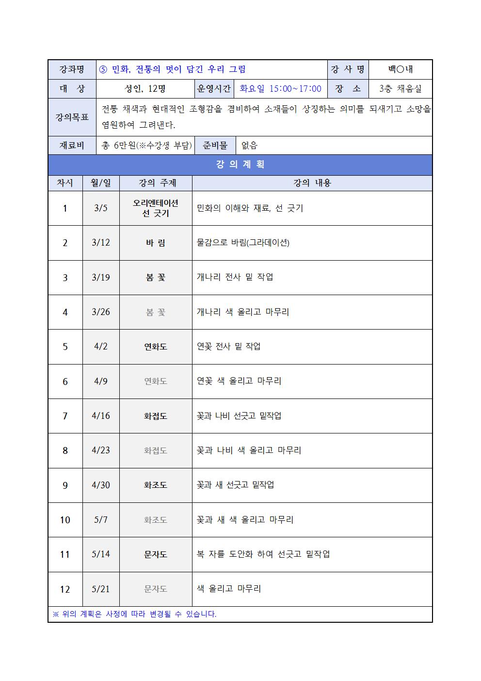온라인 신청 및 조회 신용도서관 (상반기 정기강좌)민화, 전통의 멋이 담긴 우리 그림 강좌대상 : 성인 수강기간 : 2024-03-05 ~ 2024-05-21 : ~ : (화) 접수시간 : 2024-02-13 09시 ~ 2024-03-05 23시 수강인원(인터넷/대기) : 12명 (10)명 강사명 : 백경내 장소 : 3층 채움실 비용 : 6만원(개강일 전까지 강사님 계좌로 납부) 재료비는 강사님 계좌로 개강 1주일 전까지 입금해 주시기 바랍니다. 농협 246-12-004737 (예금주명 백경내 / 6만원) 신청승인 취소하면 승인 내역에서 삭제됩니다 마**(010-2***-8***) 2024-02-14 16:21 류**(010-9***-2***) 2024-02-17 12:17 김**(*******) 2024-02-27 19:48 박**(010-5***-6***) 2024-02-29 19:40 대기