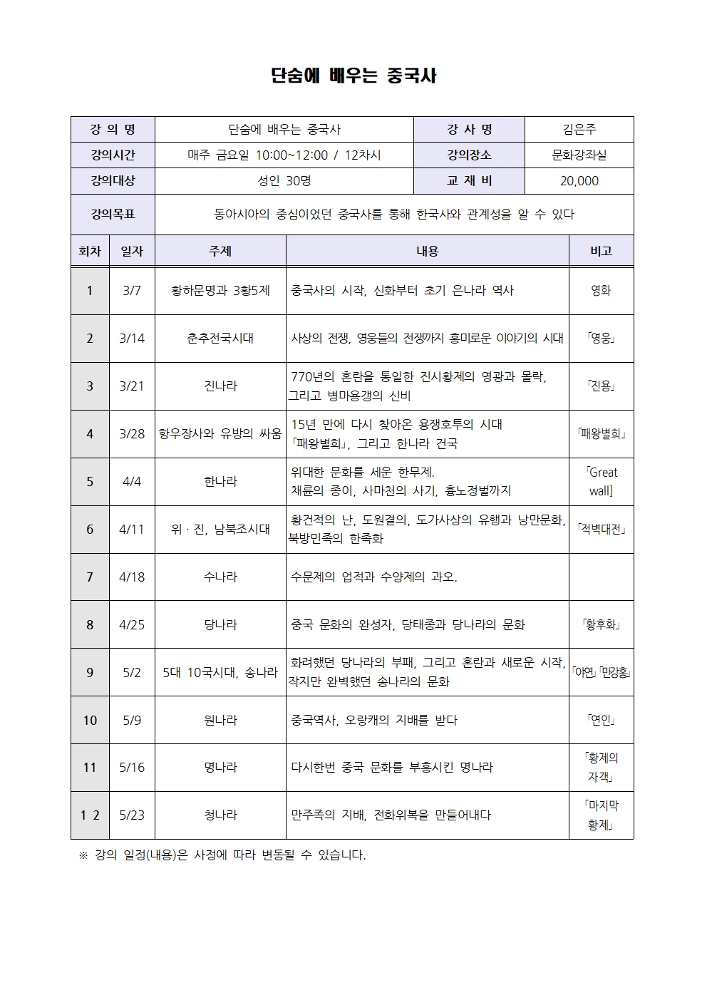 온라인 신청 및 조회 운암도서관 [정기강좌] 단숨에 배우는 중국사 강좌대상 : 성인 수강기간 : 2025-03-07 ~ 2025-05-23 10:00 ~ 12:00 (금) 접수시간 : 2025-02-17 10시 ~ 2025-02-28 00시 수강인원(인터넷/대기) : 30명 (5)명 강사명 : 김은주 장소 : 문화사랑방 비용 : 20,000 ▶ 신 청 : 2. 17.(월) 10시 ~ 선착순 모집▶ 운 영 : 매주 금요일 10:00 ~ 12:00 / 문화강좌실▶ 대 상 : 성인 30명(12주 꾸준히 참여 가능한 수강생)▶ 교재비 : 20,000원 신청승인 취소하면 승인 내역에서 삭제됩니다 김**(010-3***-9***) 2025-02-17 10:00 윤**(010-8***-3***) 2025-02-17 10:00 조**(010-2***-8***) 2025-02-17 10:01 서**(010-3***-0***) 2025-02-17 10:01 전**(010-5***-5***) 2025-02-17 10:01 정**(010-3***-3***) 2025-02-17 10:01 박**(010-2***-3***) 2025-02-17 10:01 신**(010-4***-7***) 2025-02-17 10:01 조**(010-3***-1***) 2025-02-17 10:01 문**(010-2***-7***) 2025-02-17 10:01 정**(010-9***-0***) 2025-02-17 10:01 문**(010-2***-4***) 2025-02-17 10:01 김**(010-8***-3***) 2025-02-17 10:02 전**(010-7***-1***) 2025-02-17 10:02 이**(010-9***-0***) 2025-02-17 10:02 정**(010-2***-7***) 2025-02-17 10:02 김**(010-8***-9***) 2025-02-17 10:02 기**(010-4***-8***) 2025-02-17 10:02 김**(010-4***-3***) 2025-02-17 10:02 이**(010-5***-8***) 2025-02-17 10:02 최**(010-6***-1***) 2025-02-17 10:03 김**(010-9***-2***) 2025-02-17 10:03 이**(010-2***-7***) 2025-02-17 10:03 박**(010-2***-5***) 2025-02-17 10:03 김**(010-4***-3***) 2025-02-17 10:03 김**(010-2***-0***) 2025-02-17 10:04 김**(010-3***-1***) 2025-02-17 10:04 심**(010-2***-9***) 2025-02-17 10:09 마**(010-9***-5***) 2025-02-17 10:10 문**(010-9***-7***) 2025-02-17 10:12 대기 김**(010-2***-0***) 2025-02-17 10:16 황**(010-3***-2***) 2025-02-17 10:34 최**(010-2***-2***) 2025-02-17 10:35 양**(010-2***-5***) 2025-02-17 10:36 최**(010-6***-4***) 2025-02-21 08:15