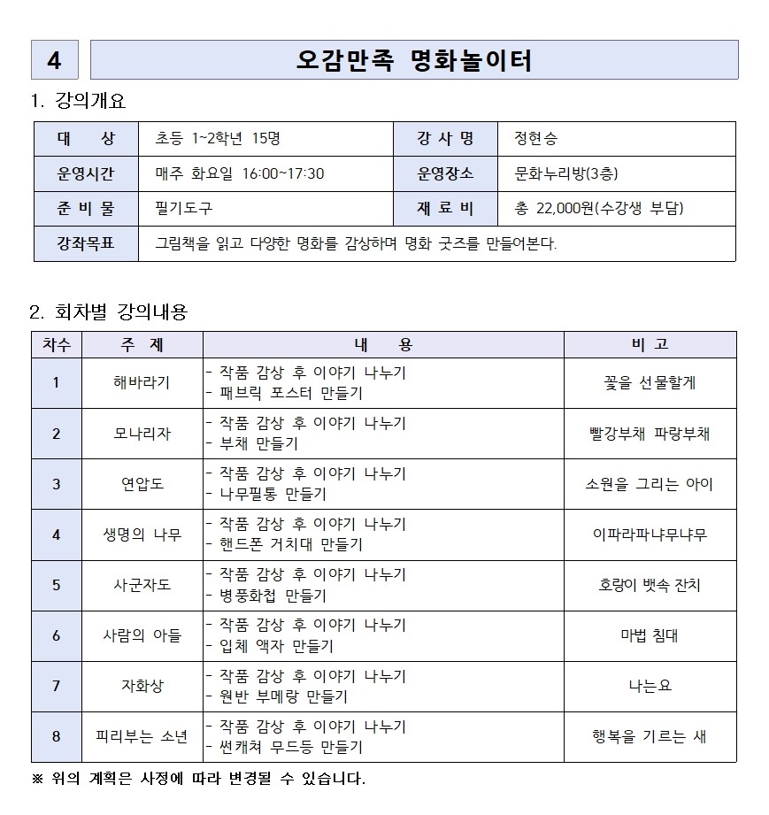 온라인 신청 및 조회 양산도서관 [정기강좌] 오감만족 명화놀이터 강좌대상 : 초등1~2학년 수강기간 : 2025-03-04 ~ 2025-04-22 16:00 ~ 17:30 (화) 접수시간 : 2025-02-18 09시 ~ 2025-02-28 23시 수강인원(인터넷/대기) : 15명 (5)명 강사명 : 정현승 장소 : 양산도서관 문화누리방 비용 : 총 22,000원 신청승인 취소하면 승인 내역에서 삭제됩니다 안**(010-6***-6***) 2025-02-18 09:00 이**(010-9***-1***) 2025-02-18 10:37 대기