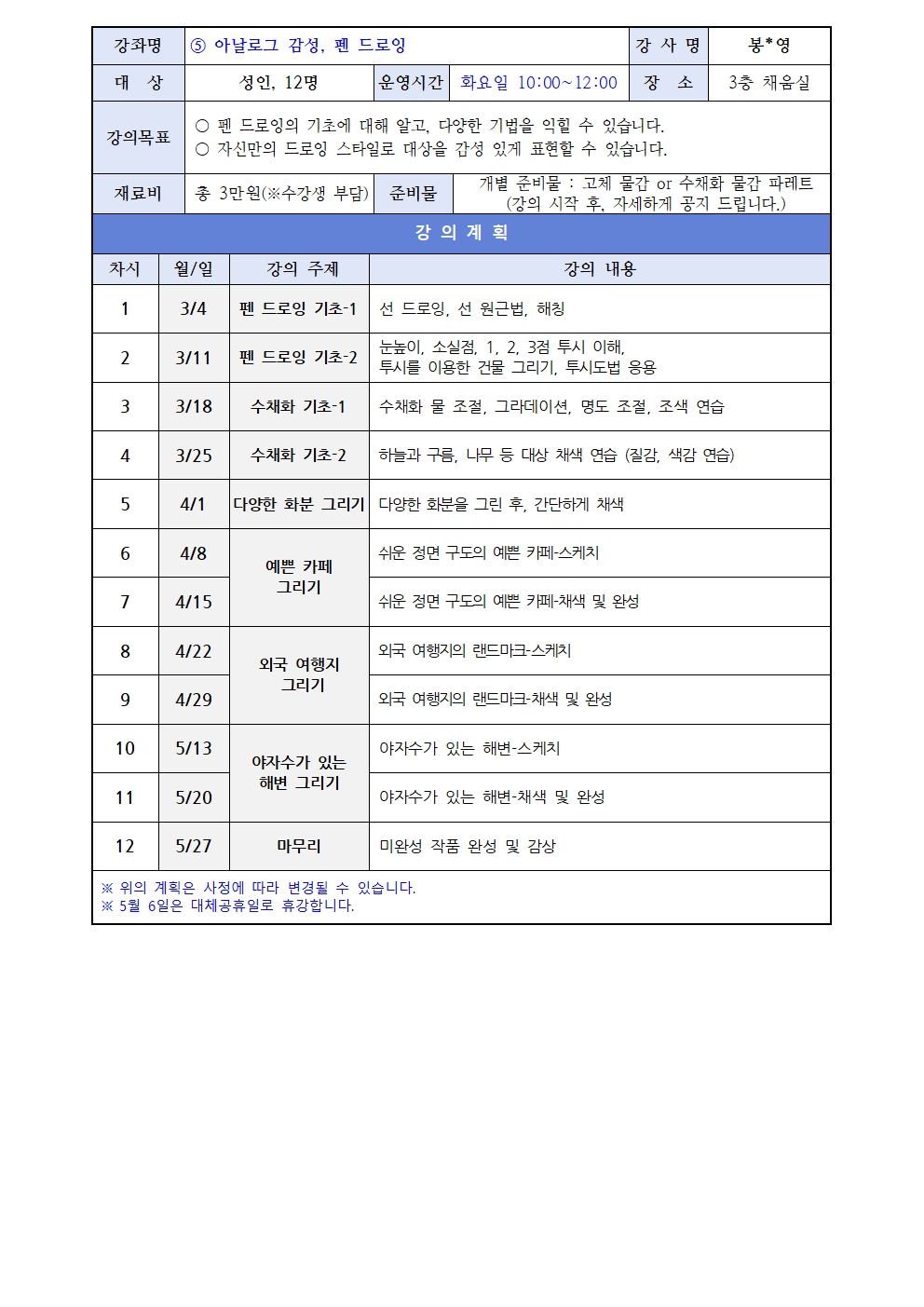 온라인 신청 및 조회 신용도서관 [정기강좌] 아날로그 감성, 펜 드로잉 강좌대상 : 성인 수강기간 : 2025-03-04 ~ 2025-05-27 10:00 ~ 12:00 (화) 접수시간 : 2025-02-13 09시 ~ 2025-02-28 00시 수강인원(인터넷/대기) : 12명 (5)명 강사명 : 봉아영 장소 : 3층 채움실 비용 : 총 30,000원 ** 해당 프로그램은 12주(3~5월) 운영됩니다. 꾸준히 참여하실 수 있는 분 신청바랍니다 ** ○ 신청 : 2. 13.(목) 오전 9시 ~ 선착순 마감 ○ 운영 : 매주 화요일 10:00~12:00 / 3층 채움실 ○ 대상 : 성인 12명 ○ 재료비 : 총 3만원(*수강생 부담) 신청승인 취소하면 승인 내역에서 삭제됩니다 정**(010-2***-1***) 2025-02-13 09:00 김**(010-9***-9***) 2025-02-13 09:01 이**(010-9***-3***) 2025-02-13 09:01 김**(010-7***-0***) 2025-02-13 09:01 허**(010-7***-2***) 2025-02-13 09:02 김**(010-3***-1***) 2025-02-13 09:02 이**(010-8***-0***) 2025-02-13 09:03 김**(010-5***-2***) 2025-02-13 09:16 김**(010-2***-3***) 2025-02-13 09:39 이**(010-8***-8***) 2025-02-13 09:40 김**(010-3***-9***) 2025-02-13 10:30 조**(010-5***-3***) 2025-02-13 13:23 대기 이**(010-9***-1***) 2025-02-13 15:28 김**(010-6***-7***) 2025-02-14 14:23 한**(010-8***-0***) 2025-02-18 15:10