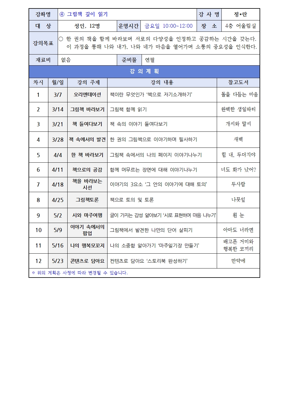 온라인 신청 및 조회 신용도서관 [정기강좌] 그림책 깊이 읽기 강좌대상 : 성인 수강기간 : 2025-03-07 ~ 2025-05-23 10:00 ~ 12:00 (금) 접수시간 : 2025-02-13 09시 ~ 2025-03-06 00시 수강인원(인터넷/대기) : 12명 (5)명 강사명 : 정순란 장소 : 4층 어울림실 비용 : 무료 ** 해당 프로그램은 12주(3~5월) 운영됩니다. 꾸준히 참여하실 수 있는 분 신청바랍니다 ** ○ 신청 : 2. 13.(목) 오전 9시 ~ 선착순 마감 ○ 운영 : 매주 금요일 10:00~12:00 / 4층 어울림실 ○ 대상 : 성인 12명 신청승인 취소하면 승인 내역에서 삭제됩니다 조**(010-5***-3***) 2025-02-13 09:00 안**(010-6***-0***) 2025-02-13 09:04 송**(010-5***-4***) 2025-02-13 16:53 박**(010-2***-3***) 2025-02-13 19:42 김**(010-4***-1***) 2025-02-14 16:27 김**(010-7***-7***) 2025-02-15 21:14 윤**(010-4***-3***) 2025-02-18 09:04 박**(010-5***-9***) 2025-02-18 10:54 박**(010-9***-6***) 2025-03-04 11:14 김**(010-2***-3***) 2025-03-05 13:50 대기