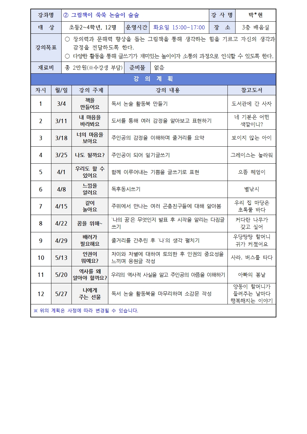 온라인 신청 및 조회 신용도서관 [정기강좌] 그림책이 쑥쑥 논술이 술술 강좌대상 : 초등 2~4학년 수강기간 : 2025-03-04 ~ 2025-05-27 15:00 ~ 17:00 (화) 접수시간 : 2025-02-13 09시 ~ 2025-03-05 00시 수강인원(인터넷/대기) : 12명 (5)명 강사명 : 박소현 장소 : 3층 배움실 비용 : 총 20,000원 ** 해당 프로그램은 12주(3~5월) 운영됩니다. 꾸준히 참여하실 수 있는 분 신청바랍니다 ** ○ 신청 : 2. 13.(목) 오전 9시 ~ 선착순 마감 ○ 운영 : 매주 화요일 15:00~17:00 / 3층 배움실 ○ 대상 : 초등 2~4학년 12명 ○ 재료비 : 총 2만원(*수강생 부담) 신청승인 취소하면 승인 내역에서 삭제됩니다 안**(010-3***-7***) 2025-02-13 09:01 박**(010-2***-1***) 2025-02-13 09:04 박**(010-8***-9***) 2025-02-13 09:07 문**(010-6***-9***) 2025-02-13 16:42 지**(010-9***-8***) 2025-02-14 09:37 김**(010-9***-4***) 2025-02-21 22:41 장**(010-7***-7***) 2025-02-25 11:38 강**(010-4***-6***) 2025-02-28 17:38 천**(010-9***-4***) 2025-03-04 11:40 대기