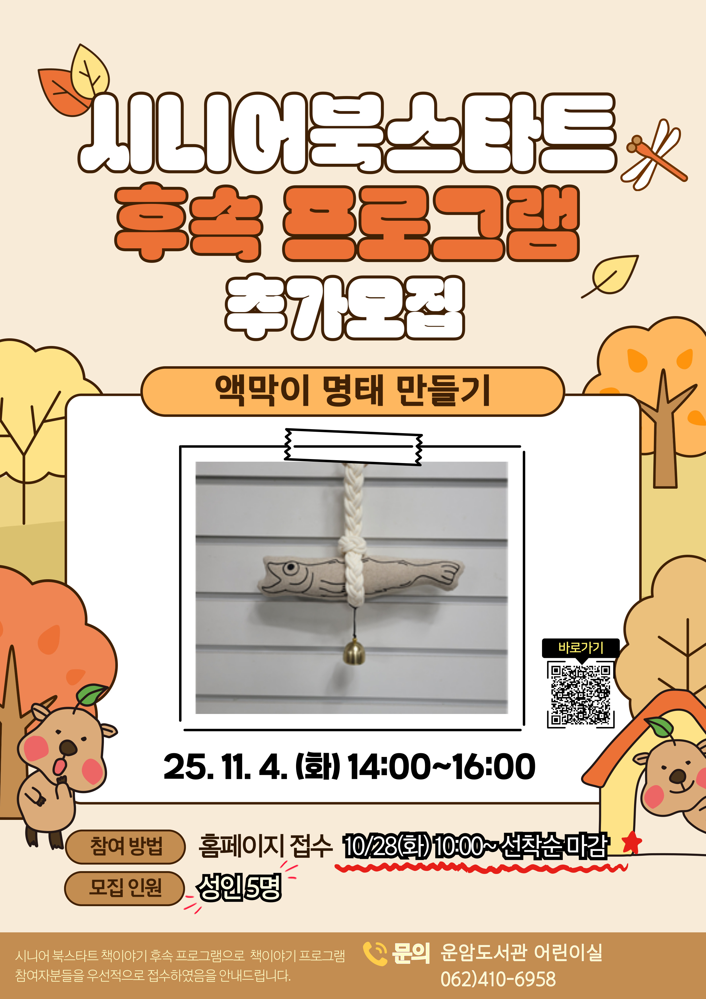 온라인 신청 및 조회 운암도서관 [시니어 북스타트 후속 프로그램] 액막이 명태 만들기 (추가모집 5명) 강좌대상 : 성인 누구나 수강기간 : 2025-11-04 ~ 2025-11-04 14:00 ~ 16:00 (화) 접수시간 : 2025-10-28 10시 ~ 2025-10-31 00시 수강인원(인터넷/대기) : 5명 (3)명 장소 : 운암도서관 문화사랑방 비용 : [시니어 북스타트 책이야기 후속 프로그램]★액막이 명태 만들기★현재 진행중인 책이야기 프로그램 참여자들을 우선적으로 접수하고,남은 인원을 대상으로 추가 접수를 진행합니다.○접수일시 | 10월 28일(화) 10:00~ 선착순 마감○신청인원 | 성인 5명(참여 가능 하신 분 누구나 신청 가능)○수업일시 | 25. 11. 4. (화) 14:00~16:00○전화문의 | 062-410-6958 신청승인 취소하면 승인 내역에서 삭제됩니다 신청자가 없습니다. 대기 신청자가 없습니다.