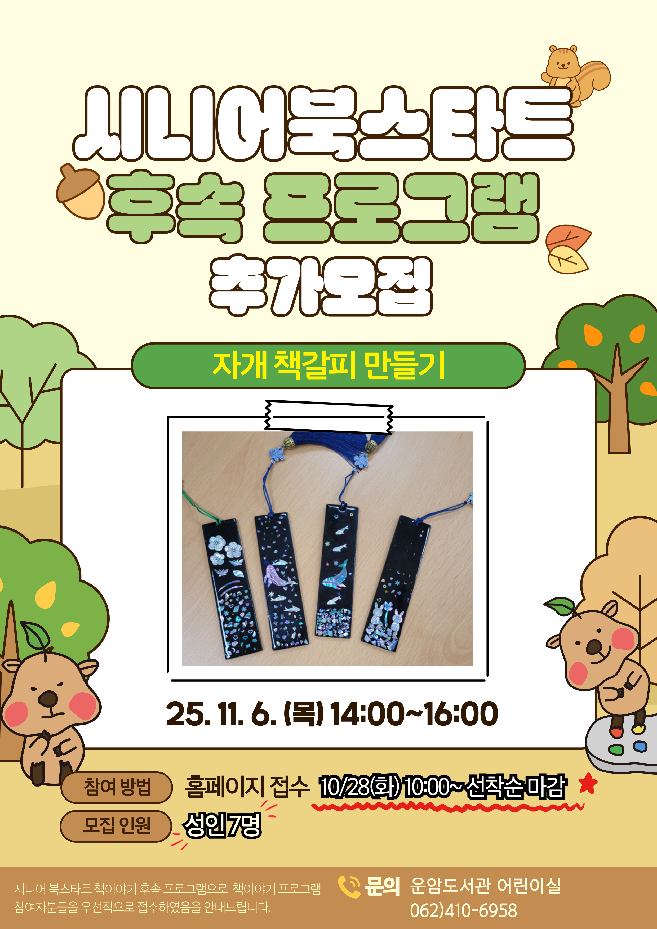 온라인 신청 및 조회 운암도서관 [시니어 북스타트 후속 프로그램] 자개 책갈피 만들기 (추가모집 7명) 강좌대상 : 성인 누구나 수강기간 : 2025-11-06 ~ 2025-11-06 14:00 ~ 16:00 (목) 접수시간 : 2025-10-28 10시 ~ 2025-10-31 00시 수강인원(인터넷/대기) : 7명 (3)명 장소 : 비용 : [시니어 북스타트 책이야기 후속 프로그램]★자개 책갈피 만들기★현재 진행중인 책이야기 프로그램 참여자들을 우선적으로 접수하고,남은 인원을 대상으로 추가 접수를 진행합니다.○접수일시 | 10월 28일(화) 10:00~ 선착순 마감○신청인원 | 성인 7명(참여 가능 하신 분 누구나 신청 가능)○수업일시 | 25. 11. 6. (목) 14:00~16:00○전화문의 | 062-410-6958 신청승인 취소하면 승인 내역에서 삭제됩니다 신청자가 없습니다. 대기 신청자가 없습니다.