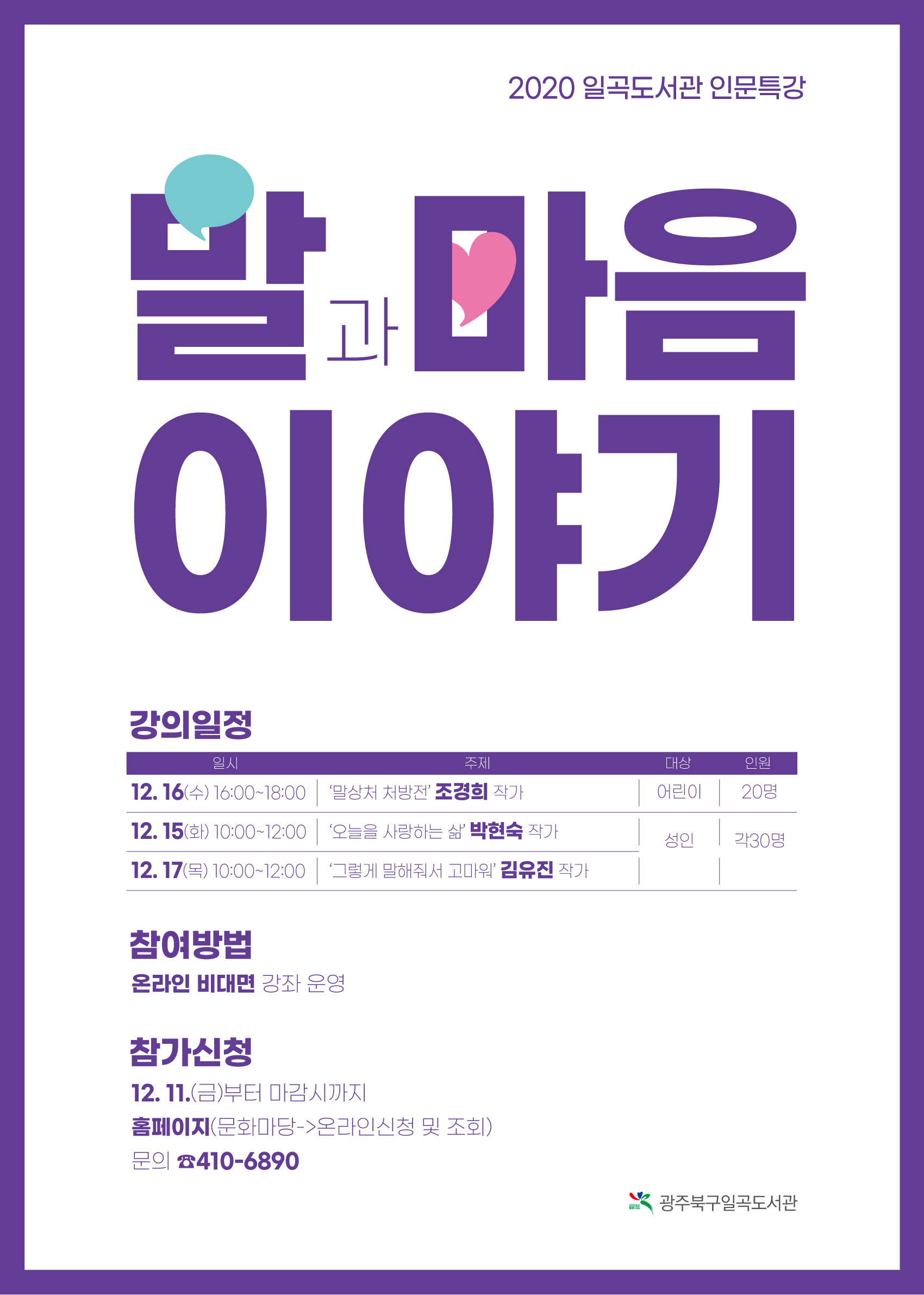 온라인 신청 및 조회 일곡도서관 2020 일곡도서관 인문특강 「말과 마음 이야기 - 마음 3」 성인 참여자 모집 강좌대상 : 성인 수강기간 : 2020-12-15 ~ 2020-12-15 10:00 ~ 12:00 (화) 접수시간 : 2020-12-04 09시 ~ 2020-12-14 16시 수강인원(인터넷/대기) : 30명 (10)명 강사명 : 박현숙 작가 장소 : 온라인 강의 비용 : 무료 첨부파일 : ○강사프로필 및 강의계획서(박현숙작가).hwp (14848KB) <마음 3> ○ 주 제 : 오늘을 사랑하는 삶 ○ 일 시 : 12월 15일 화요일, 10:00 ~ 12:00 ○ 대 상 : 성인 ○ 강 사 : 박현숙 작가 ○ 방 법 : 온라인 강의 - 참여자 개인별 알림 ○ 문 의 : 410-6890 ※ 상황에 따라 강의시간 변경이 될 수 있습니다. ※ 자세한 강의 내용은 첨부파일(강사프로필 및 강의계획서)을 참고 바랍니다. 신청승인 취소하면 승인 내역에서 삭제됩니다 신청자가 없습니다. 대기 신청자가 없습니다.